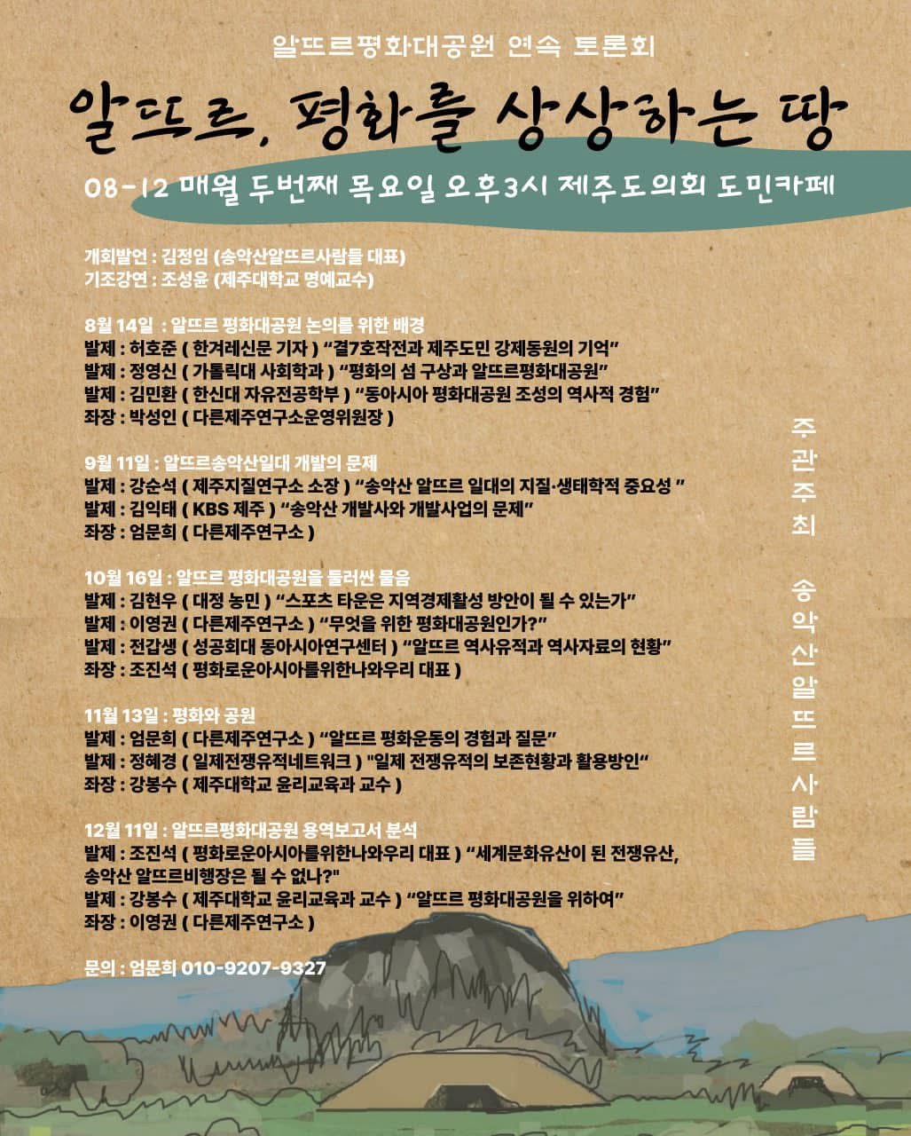 일정과 형태 : 2025년 8월 14일 목요일 오후 3-5시, 제주도의회 도민카페에서 첫 토론회를 갖고, 이후로 12월 (11일 목요일)까지 매월 두 번째 목요일, 같은 시간 오후 3시부터 5시)